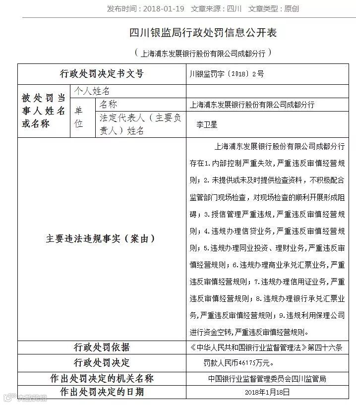 除此之外,在2018年1月19日,银监会公告了近期另一起亿级的天价罚单:浦发银行成都分行因掩盖不良贷款等问题被罚4.62亿元。