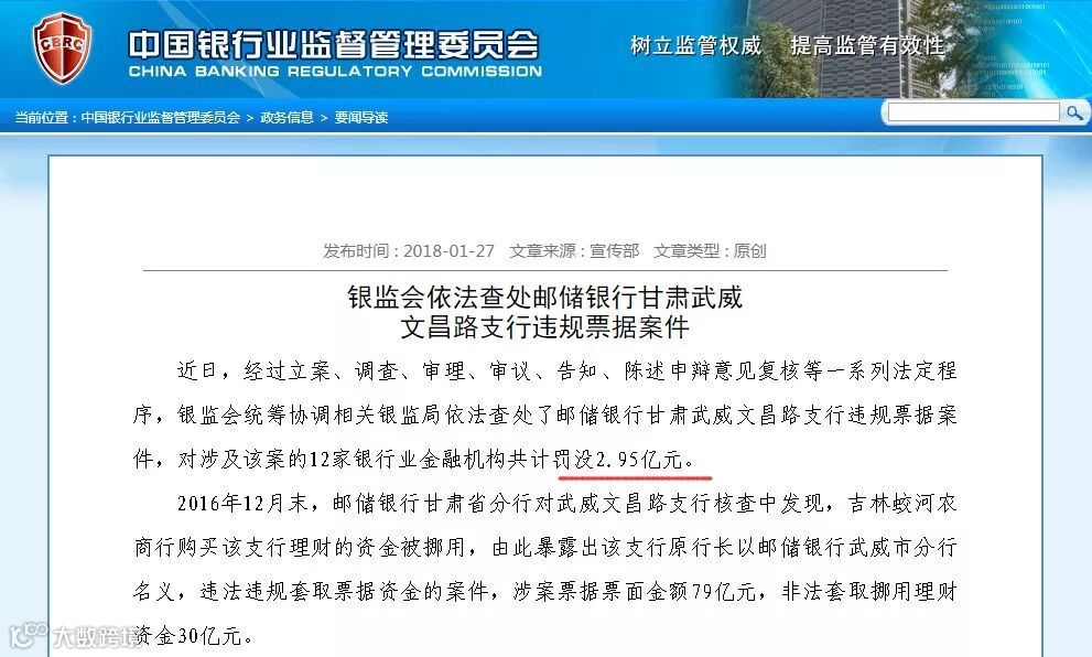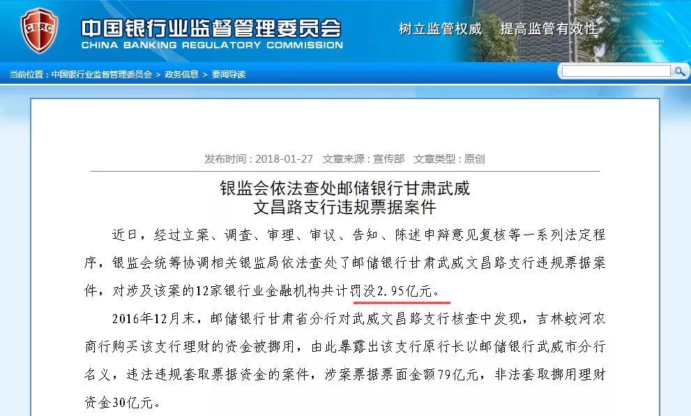 1月27日,银监会公告称,查处邮储银行甘肃武威文昌路支行违规票据案件,对涉案12家银行业金融机构共计罚没2.95亿元。