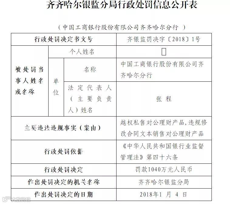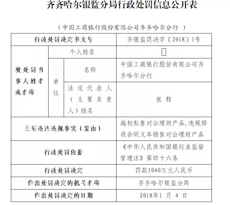 接着1月12日,据黑龙江银监局消息,中国工商银行黑龙江省辖内分支机构的54.7亿元理财产品涉嫌违规,违规案多涉及违规修改合同文本销售对公理财产品。其中,工行齐齐哈尔分行、工行大庆分行、工行黑龙江省分行营业部的违规案由还包括越权私售对公理财产品。黑龙江银监局称,按照过罚相当原则,依法对工行黑龙江省分行及所辖13家二级分行及责任人予以累计3400万元罚款。
