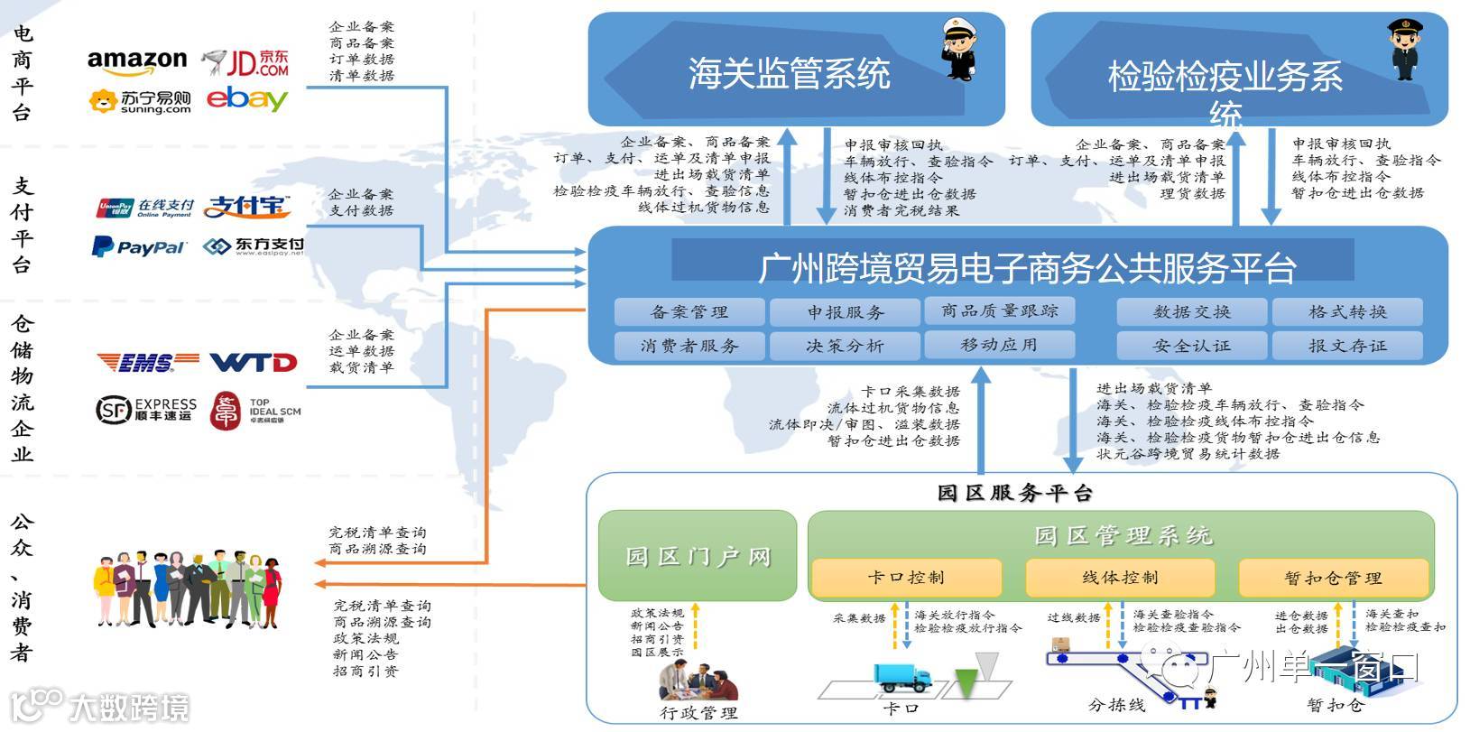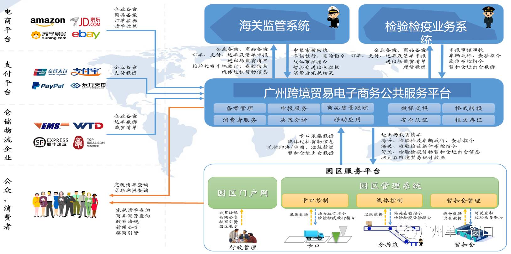 广州“单一窗口”跨境电子商务平台(以下简称“广州跨境电商平台”)包涵经营主体和电子商务全流程的综合管理功能,以及在线通关、结汇、退税申报等应用功能,实现商务、海关、国税、工商、检验检疫、外汇等部门信息共享。