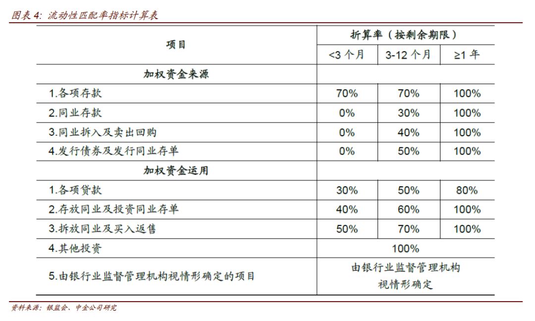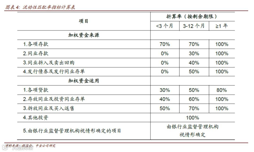 根据商业银行流动性新规,银行流动性匹配率=加权资金来源÷加权资金运用,该指标应当2018年底达到90%,2019年底达到100%。