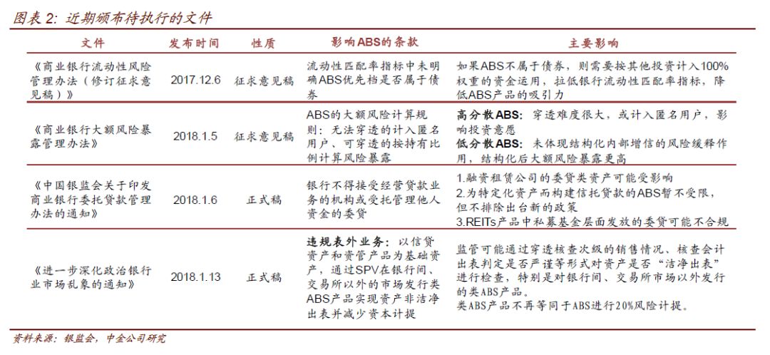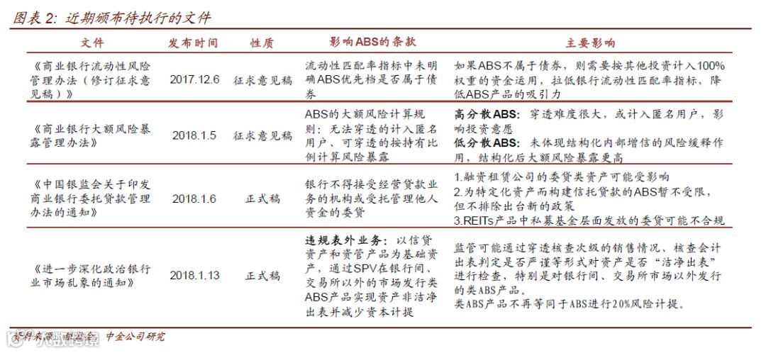 在近期金融监管机构密集推出的多项监管文件中,不少文件的规定对ABS产品的设计和投资需求都可能产生重要影响。此外,2018年1月1日也是部分过去发布的监管文件的执行起始日,新规执行也将对ABS的投资产生影响。本篇报告我们系统的梳理了近期监管文件对ABS产品设计、投资需求两方面的影响,供投资者参考。