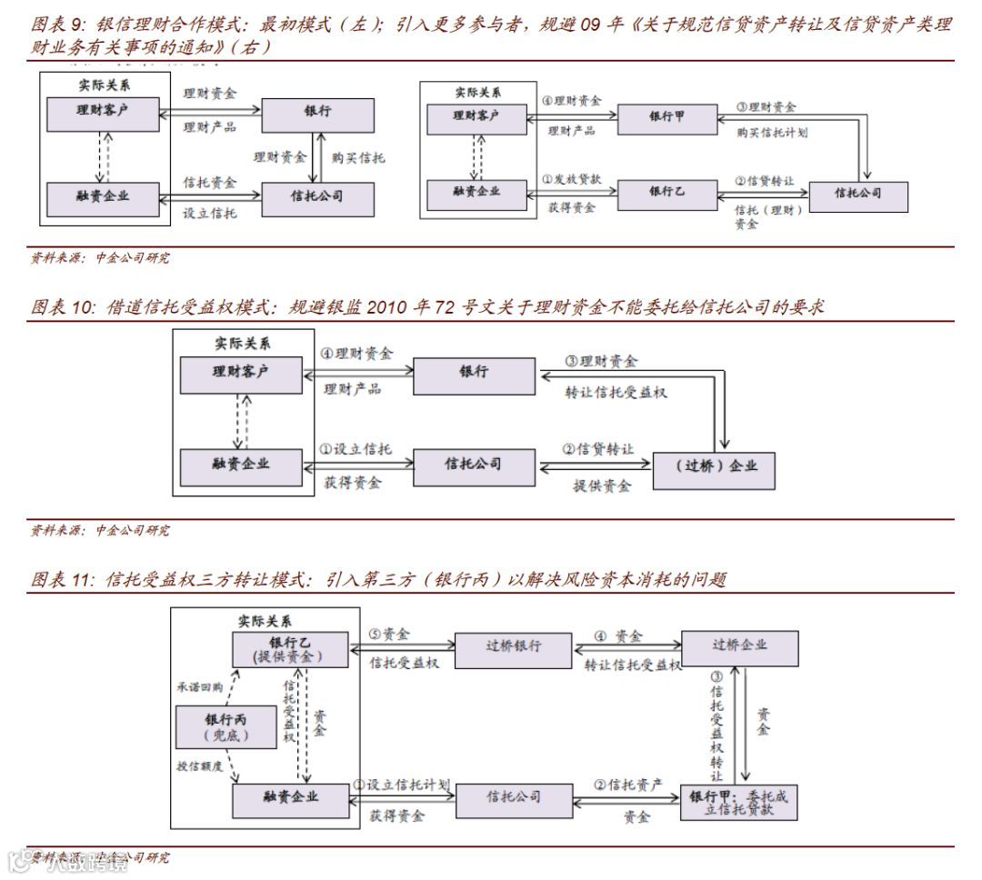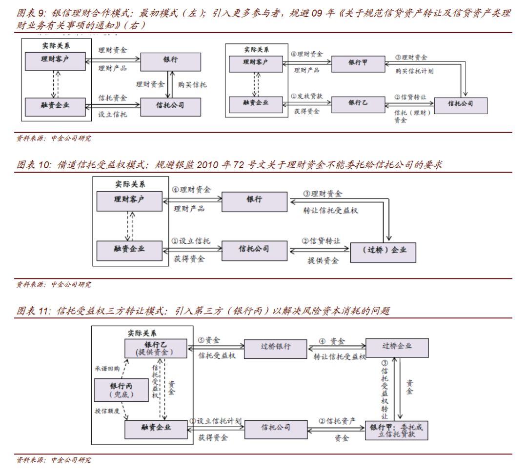 2008年底,银监会开始发文规范银信合作,包括08年12月发布的《银行与信托公司业务合作指引》(83号文)、09年12月发布的《关于进一步规范银信合作有关事项的通知》、10年8月发布的《关于规范银信理财合作业务有关事项的通知》(72号文)、以及之后发布的多份文件。政策严格要求融资类业务余额比例、银信理财合作风险资本计提等,并要求银行在2011年底前将银信理财合作业务表外资产转入表内。与此同时,票据违规操作也曾是绕开信贷额度的重要方式,在2011年也遭遇了监管机构的严厉打击。