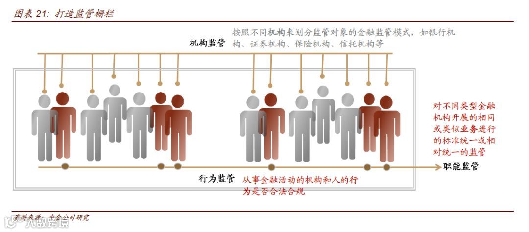 监管的逻辑已经发生了巨变,从机构监管向职能监管、行为监管转变,摆脱“父爱主义”,从而构建真正的监管栅栏。银监会2018年4号文明确表示,要突出“监管姓监”,将监管重心定位于防范和处置各类金融风险,而不是做大做强银行业。而负面清单制度导致银行违规无处遁藏。机构的股权结构、合规文化、责任人制度加强内部约束。除此之外,银监会要求强化银监会各机构监管部和各银监局督促指导工作职责。改变应罚未罚及处罚偏松偏软等问题,要形成“整改-评估-整改”的工作机制。证监会也从15年股市大幅调整之后,大力打击各种违规操作行为,整顿市场秩序,并收到积极成效。