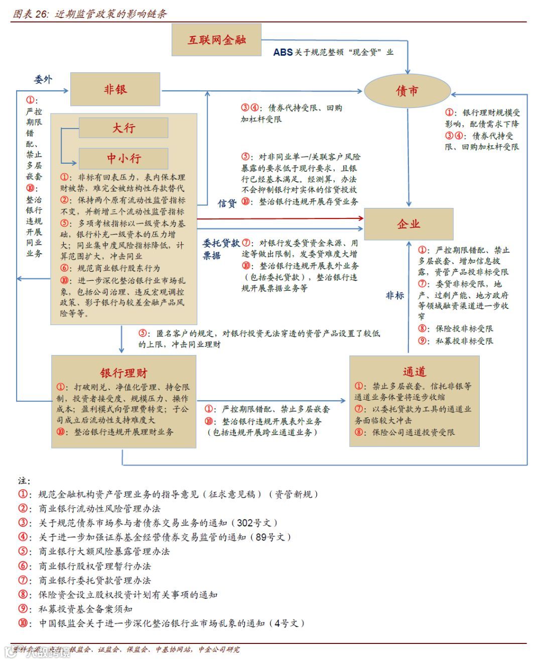 (5)对于各类型金融机构而言:穿透监管、实质重于形式监管原则下,银行表内资产端和负债端摆布难度增大,无序扩表空间受限,补充资本金压力大增;净值化管理、去资金池下,银行理财也将进入痛苦调整期,不再是“买买买”的主力;其他金融机构,如资管、信托/通道、公募、货基、私募等,几家欢喜几家愁。