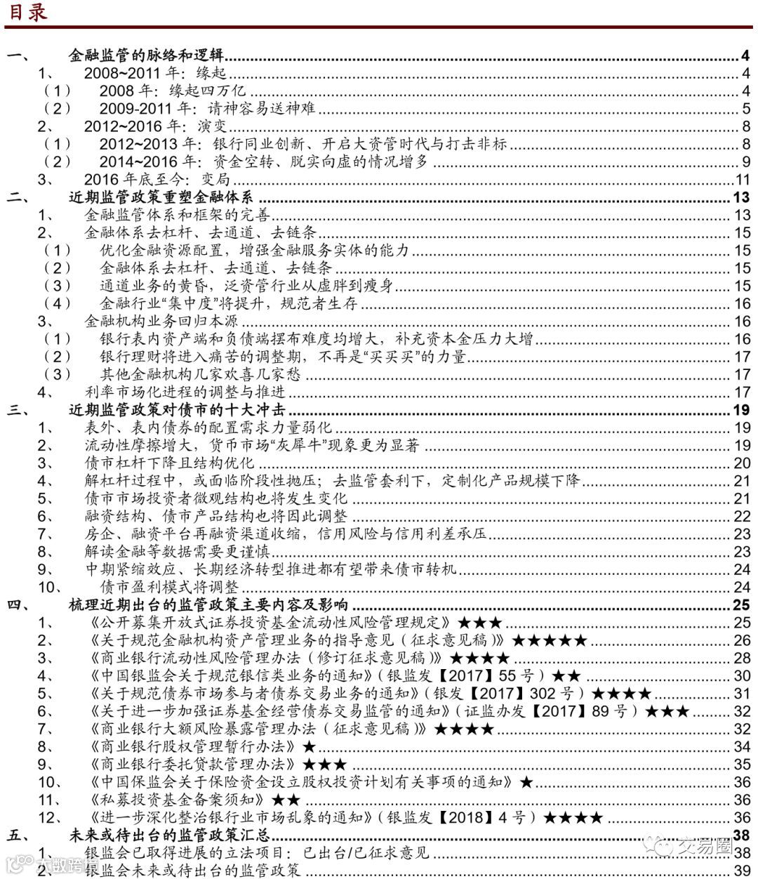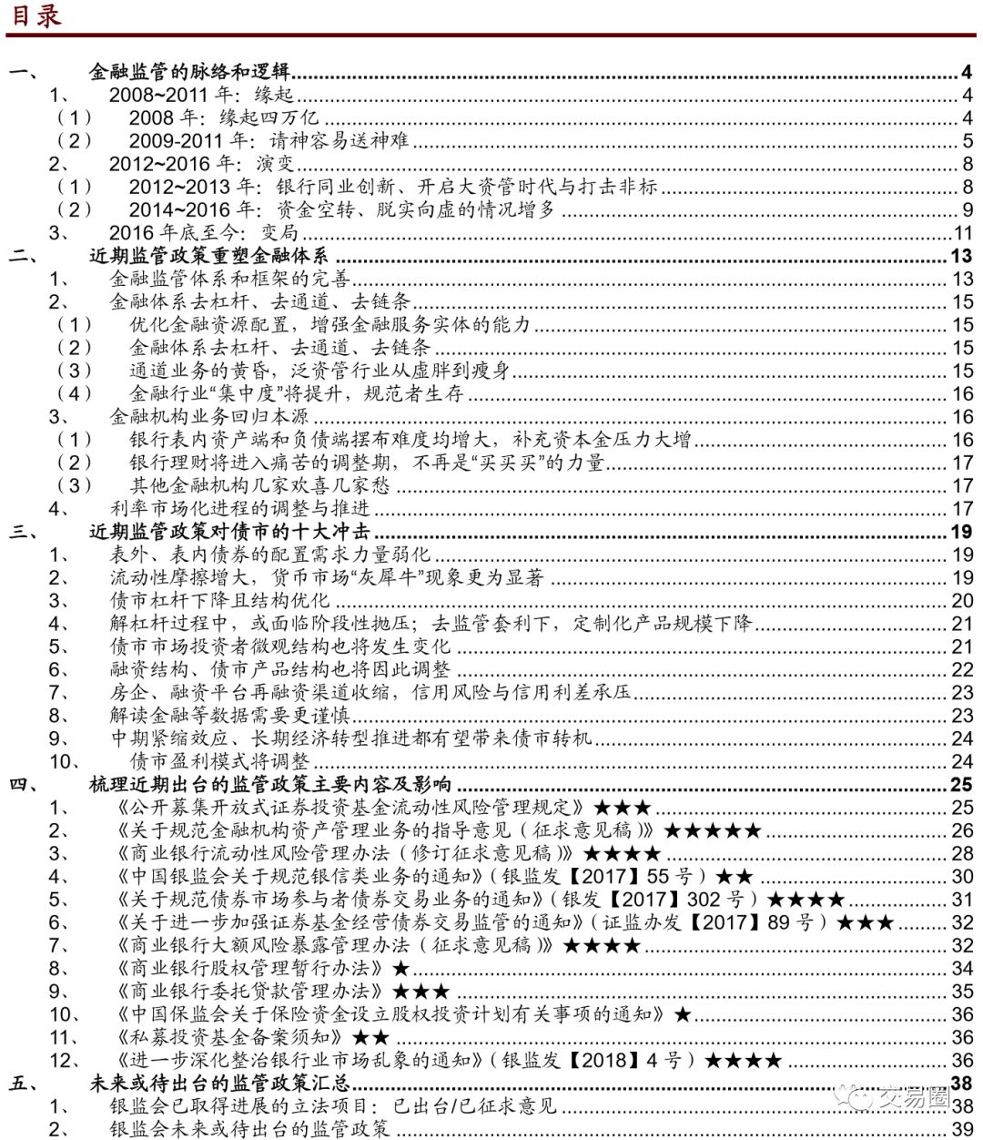 近期出台的一系列监管政策将重塑金融体系、生态链,影响流动性格局;对我们身处的债券市场,也将从交易行为、资金来源与投向、产品结构、微观投资者结构等多个维度产生深远影响。本文回溯2008年以来的金融市场和机构行为,梳理本轮金融监管的脉络和逻辑;细致研究近期出台的一系列监管政策的主要规定及影响;并在此基础上,探讨本轮金融监管对金融体系、各类型机构、流动性、债券市场的影响。此外,对未来或出台的监管政策进行了梳理汇总。
