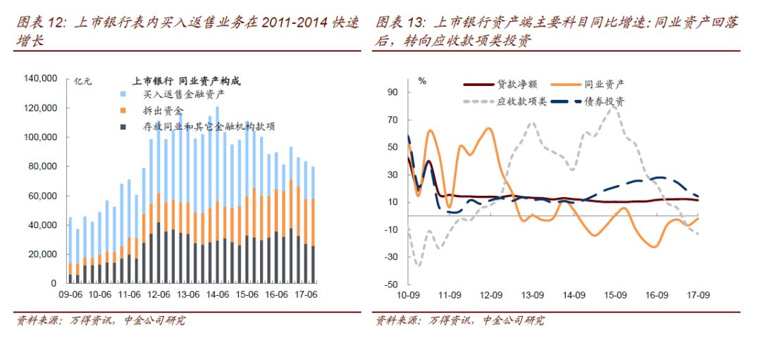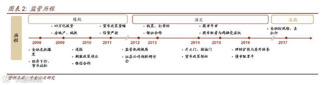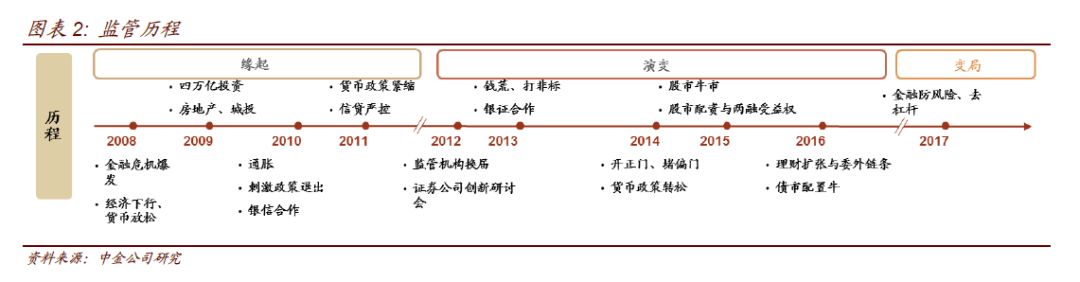 (2)2012~2016年:演变。12年,经济“类滞胀”,我国再度实施宽松货币政策。且党的十八大提出要深化审批制度改革,继续简政放权,深化金融体制改革等。叠加监管换届、利率市场化因素,银证合作崛起,多因素带动表外业务、通道业务快速扩张。13年,银监会颁布8号文,旨在规范非标投资,但却意外为非标“正名”。在多头监管下,衍生出多种绕开监管的途径。14、15年,伴随流动性宽松、内部扩张冲动下:中小银行主动扩表,同业创新带动“同业存单-同业理财-委外”链条开始膨胀;保险通过万能险融资频频举牌上市公司;互联网金融无序膨胀;城投、房地产借道政府购买、产业基金和PPP等大举融资。