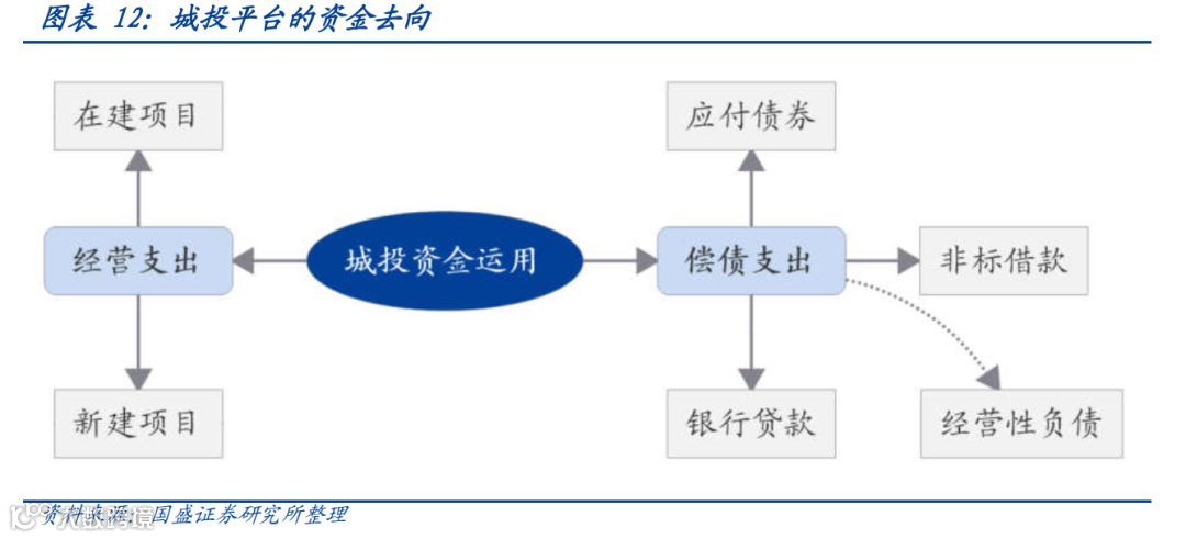 从现金流量表看,一般企业的现金运用主要有经营支出、投资支出和偿债支出。而城投平台由于其特殊性,投资往往是主要经营内容,因此可将投资支出归并到经营支出中,资金去向就主要是经营支出和偿债支出。