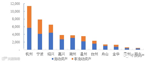 从资产规模来看,截至2016年末,样本城投企业2016年末总资产合计42,968.00亿元,地方经济财政实力较强的杭州、宁波及绍兴的城投企业资产规模较大,上述三市城投平台资产总额均在5,000亿元以上,而丽水市城投平台资产总额则最低。2016年末,浙江省各市城投公司总体资产结构均以流动资产为主,平均占比65.38%,但考虑到样本平台主体2016年末资产总额中以往来款和土地使用权为主的其他应收款和存货科目占比较高,达到了44.30%,一定程度上弱化样本城投公司的资产流动能力。