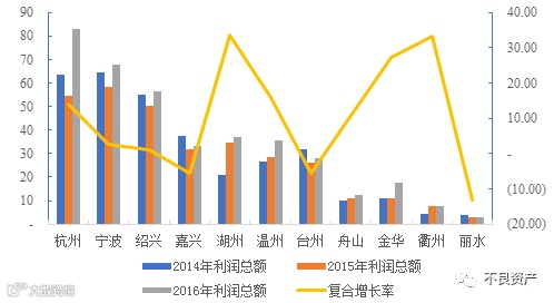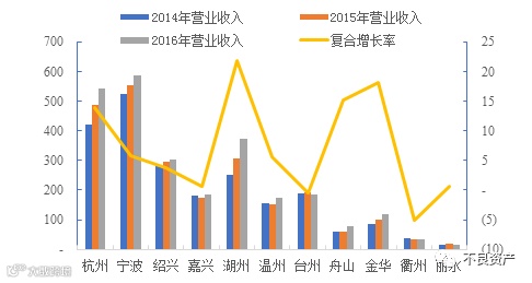 从收入规模看,2016年样本企业营业收入共计2,596.02亿元,杭州和宁波的样本企业收入总体规模位于前两位,二者2016年均超过500亿元,而其他各市的样本企业收入规模大多分布在100-400亿元之间。从收入增速来看,2014-2016年湖州的的复合增长率最高,超过了20%,而台州市和衢州市样本企业营业收入总额在2014-2016年出现下降。