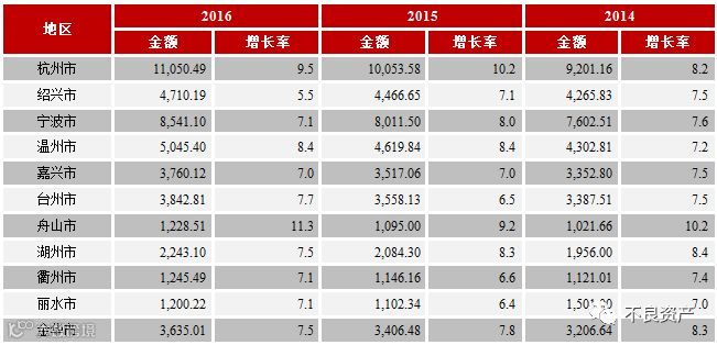 表1 2014-2016年浙江省各地级市GDP情况 (单位:亿元,%)