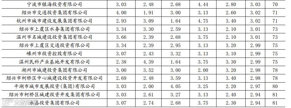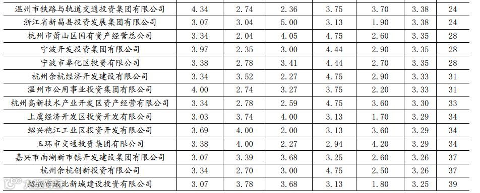 由于浙江省城投平台数量较多,一共174个,剔除存量债余额小于10亿元的平台,对剩下126个平台进行打分排序。每个指标划分为5档,分别对应1-5分。根据打分结果,排名前20的城投平台相对资质较好,如宁波交通投资控股有限公司、浙江瓯海城市建设投资有限公司、杭州市地铁集团有限责任公司等。排名最后20的城投平台资质相对较弱,如舟山海洋综合开发投资有限公司、义乌市国有资本运营有限公司、湖州织里城市建设投资运营集团有限公司等。具体见图表14。
