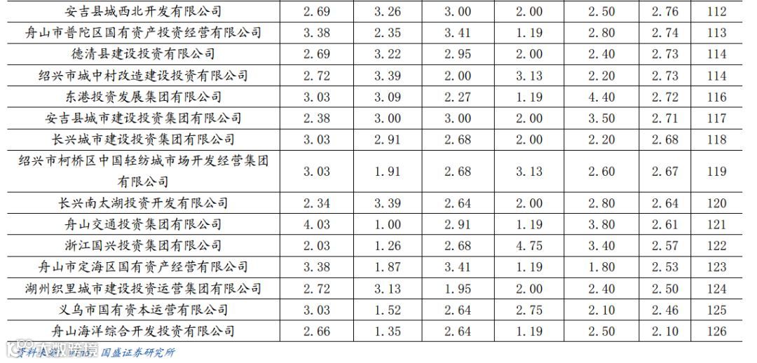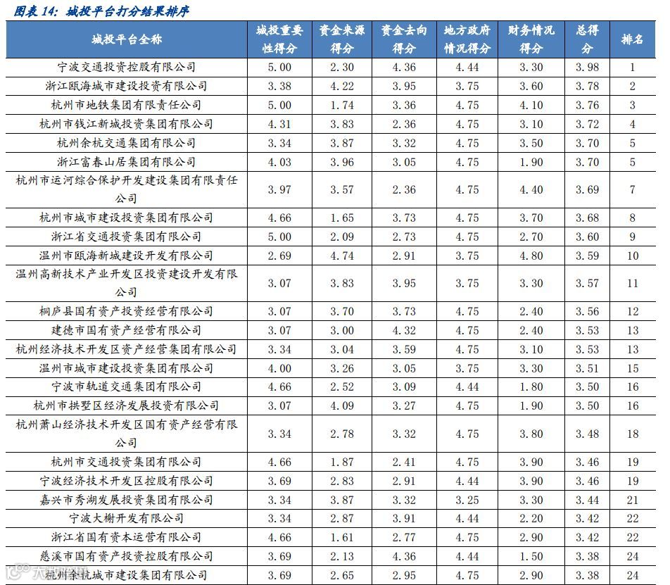 我们主要从城投平台重要性、资金来源和资金去向角度进行分析,并对126个城投平台进行打分排序。根据打分结果,排名前20的城投平台资质相对较好,如宁波交通投资控股有限公司、浙江瓯海城市建设投资有限公司、杭州市地铁集团有限责任公司等。排名最后20的城投平台资质相对较弱,如舟山海洋综合开发投资有限公司、义乌市国有资本运营有限公司、湖州织里城市建设投资运营集团有限公司等。