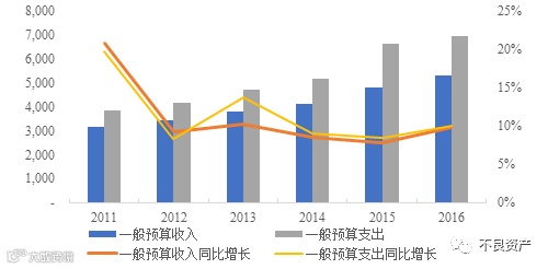 图2 2011-2016年浙江省财政收支情况(单位:亿元)