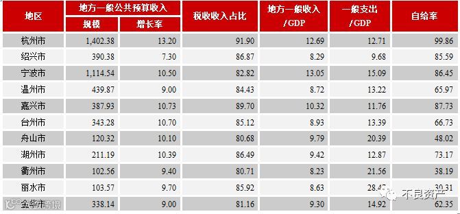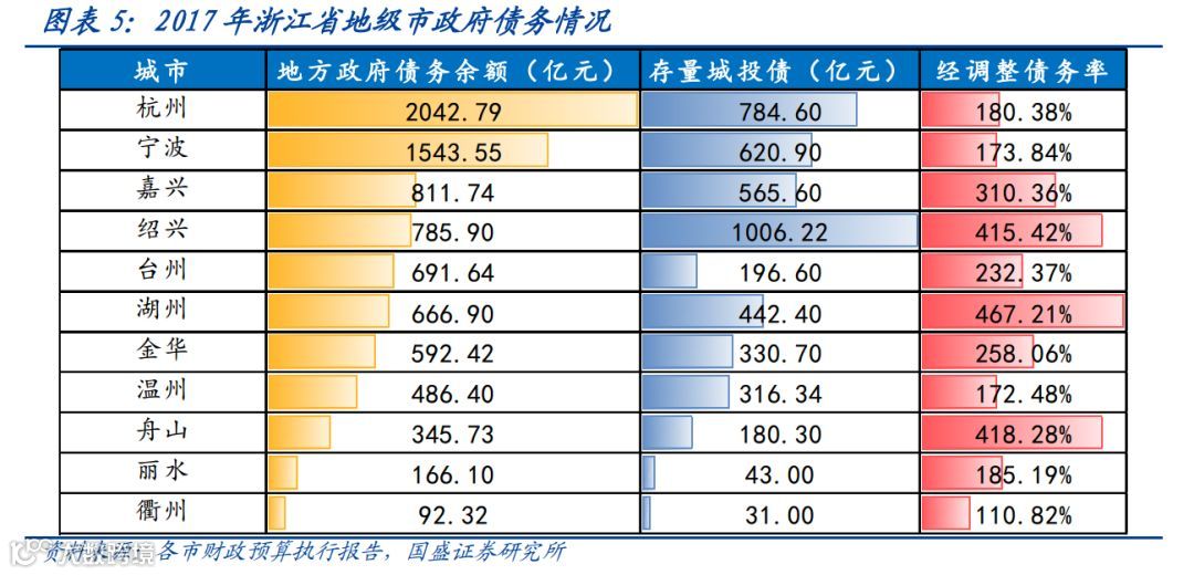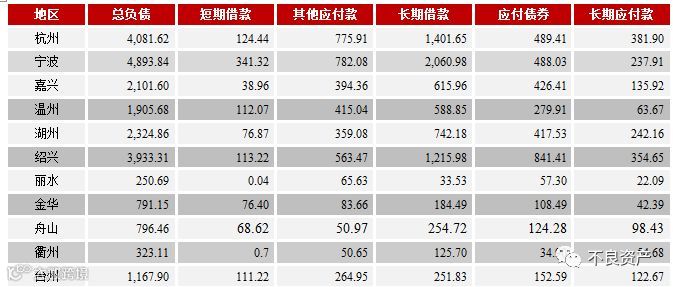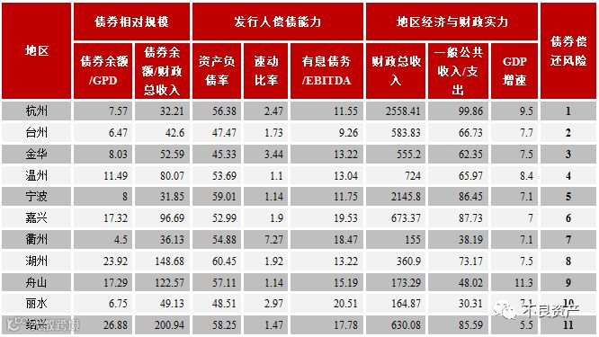 从经济、财政和经调整债务率综合来看,舟山、湖州、丽水和衢州资质较弱,嘉兴、绍兴、金华、温州和台州处于中游水平,杭州和宁波资质较好。