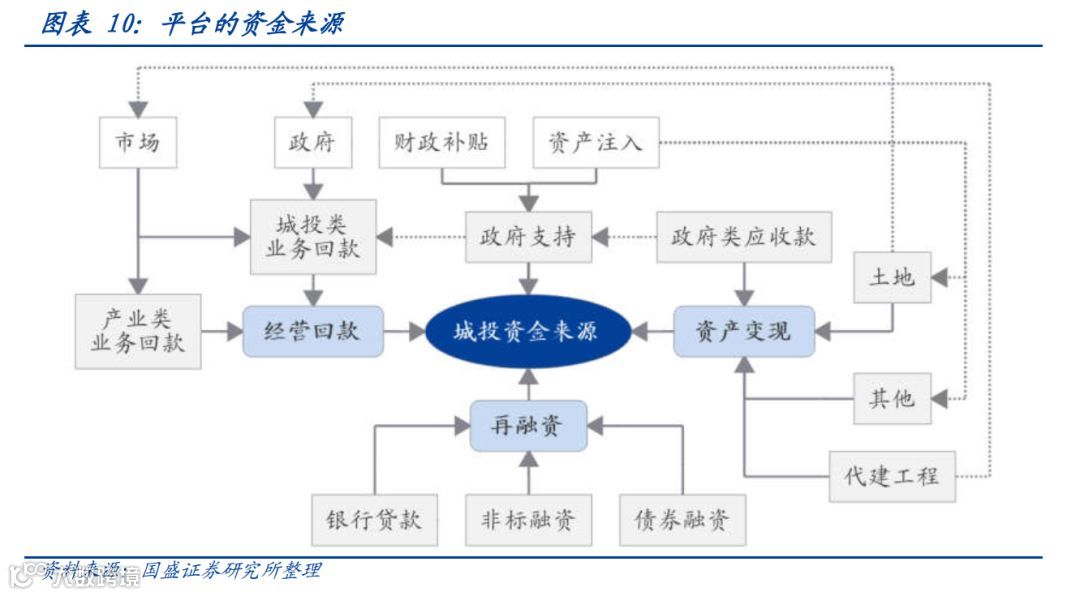 首先厘清城投平台主要有哪些资金来源及其可得性。一般而言,城投的资金来源有四个方面:再融资、经营回款、政府支持和资产变现。由于金融严监管导致再融资渠道收紧,相比以往,城投获取再融资的难度增加。