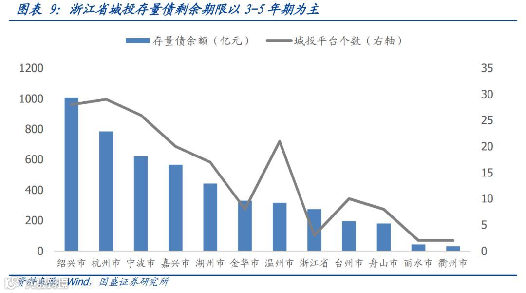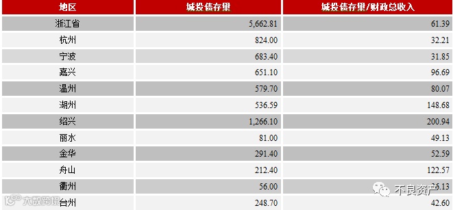 从浙江省各地城投债券偿还风险的相对水平来看,绍兴、丽水、舟山、湖州和衢州的城投偿债风险最高;嘉兴、宁波、温州和金华的城投偿债风险较低;杭州和台州的城投偿债风险最低