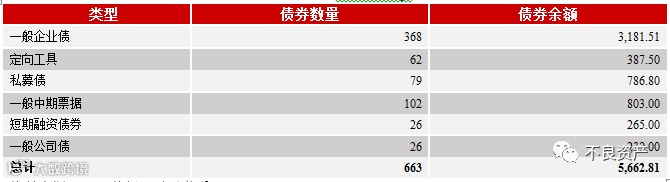 截至2017年11月30日,浙江省165家样本城投企业存量城投债共计663支,债券余额共计5,662.81亿元,其中一般企业债3,181.51亿元、定向工具387.50亿元、私募债786.80亿元、一般中期票据803.00亿元,其余主要为短融及定向工具等。