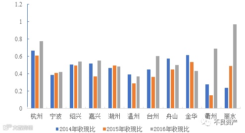 从样本企业主营业务收现情况来看,2014-2016年样本企业平均收现比分别为0.49、0.42及0.54,呈现逐年提高的趋势,但整体收现比较低。分城市来看,2016年丽水市城投企业的整体收现比最高,超过1,其余地级市均小于1。