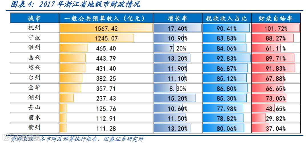 从财政情况看,2017年,一般公共预算收入排名先后顺序分别为杭州、宁波、温州、嘉兴、绍兴、台州、金华、湖州、舟山、丽水和衢州。其中,杭州和宁波一般公共预算收入超过1000亿元,而舟山、丽水和衢州在150亿元以下。增长率方面,杭州和湖州一般公共预算收入增长率较高超过15%,而金华和温州增长率较低不到10%。一般公共预算收入质量方面,得益于浙江省整体经济发展水平较高,各地级市的税收占比均处于较好水平,收入质量较高,占比均在75%以上,其中杭州和嘉兴超过90%。财政自给率方面,经济较弱地区的财政自给能力明显较差,衢州和丽水的财政自给率均低于40%,对上级补助收入依赖较重,而经济较发达的杭州和绍兴财政自给率超过90%。