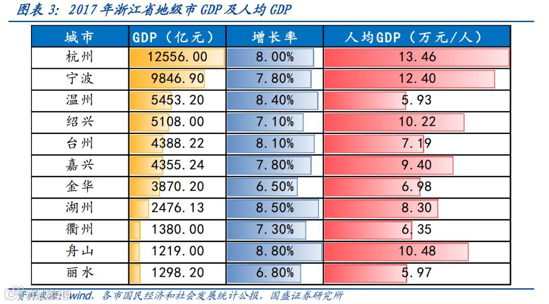 从经济情况看,2017年,11个地级市GDP总量排名先后顺序分别为杭州、宁波、温州、绍兴、台州、嘉兴、金华、湖州、衢州、舟山和丽水。其中,杭州、宁波、温州和绍兴GDP总量超过5000亿元,而衢州、舟山和丽水在1500亿元以下;增长率方面,舟山和湖州较高,分别为8.8%和8.5%,丽水和金华较低,分别为6.8%和6.5%;人均GDP方面,杭州、宁波、舟山和绍兴人均GDP超过10万元/人,而丽水和温州不足6万元/人。