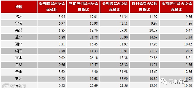 表9 2016年末浙江省各地级市样本城投企业各类债务占比(单位:%)