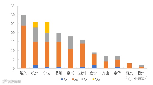 从样本企业信用评级情况来看,我们分析了截至2017年11月30日存在尚未偿付债券的165家样本城投企业的最新长期主体信用评级情况,其在各市的分布情况如下图(其中,3个省级平台有1家为AA,2家为AAA)。整体来看,由于经济财政实力较强,杭州和宁波的城投企业整体级别较高,AA+及以上级别的主体在当地城投企业中的占比相对其他地级市较高,其中AAA城投企业只有杭州和宁波拥有,除了丽水之外,其他地级市均拥有AA+级别的城投企业。