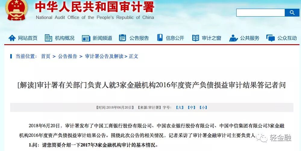 2018年6月20日,审计署发布了中国工商银行股份有限公司、中国农业银行股份有限公司、中国中信集团有限公司3家金融机构2016年度资产负债损益审计结果公告。围绕此次公告的相关情况,记者采访了审计署金融审计司主要负责人。