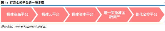 地方政府是建立金控平台的主要推手,地方金控大多为地方国有独资或控股企业。借助地方政府力量,金融控股集团能够直接控制地方核心金融企业,掌握较为齐全的金融牌照。打造地方政府金控可以大致分为以下五个步骤:搭建资源平台、搭建云平台、搭建资本平台、进一步抢滩金融资产、优化金融平台。