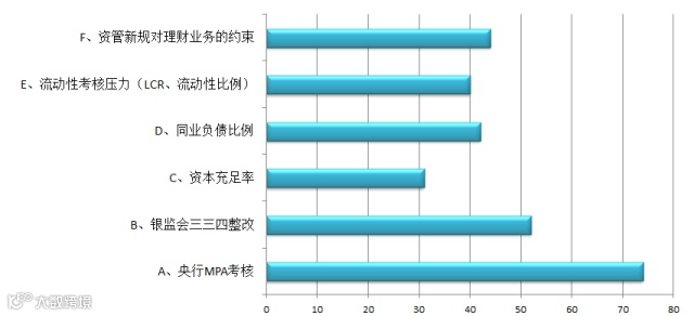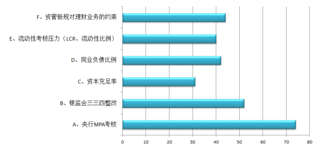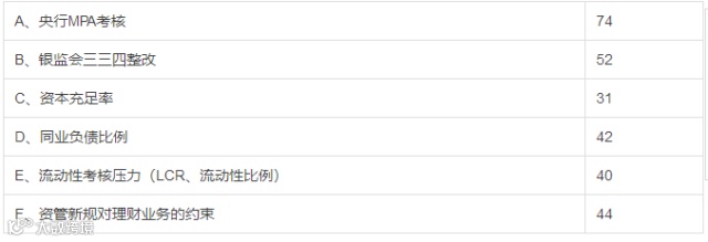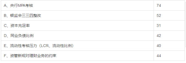 72%的中小银行反馈MPA考核压力较大,50%反映银监会三三四整改压力较大,表明MPA以及银监会的系列监管压力最大。