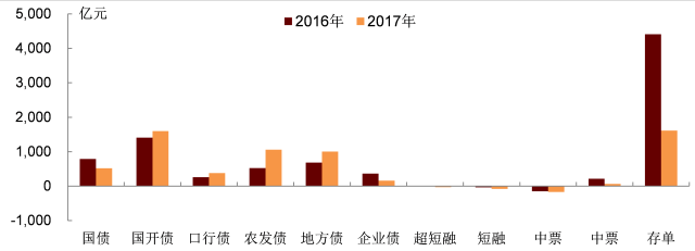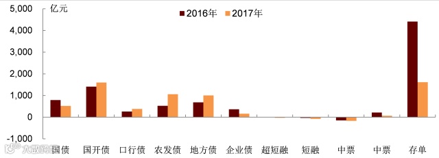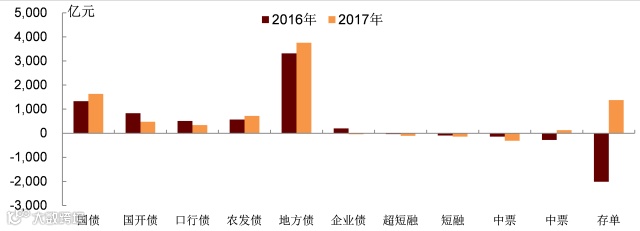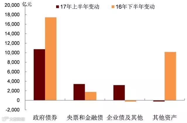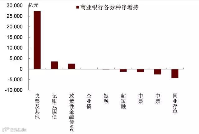 商业银行今年在存款增长乏力和信贷需求较旺影响下,配债额度有限,配置力量主要集中在国债和地方债,对同业存单、信用债的配置有限。相同的结论我们可以从上市银行资产负债表和托管数据中找到,从托管数据来看,今年前三季度全部商业银行总计增持2.77万亿债券,主要以地方债和国债为主,大幅减持了短融超短融、中票和同业存单。从上市银行证券投资科目来看,17年上半年上市银行持有的债券总量较16年下半年有明显下降(下图为上市银行证券投资科目债券持有详情:减持政府债券、全部商业银行1-10月主要券种净增持:主要增持地方债,小幅增持国债、政金债,减持同业存单)。
