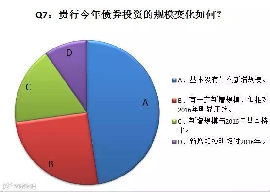 (2)今年资产负债方面:①大部分中小银行表示今年负债端压力较大,尤其是存款端压力较大、对同业负债有一定的依赖度。从上市银行数据来看,吸收存款科目三季度同比增速从二季度的9.1%大幅降至7.13%,同业负债在监管从严下,增速也有明显放缓。②三三四严监管、去空转和套利之下,42%的中小银行表示同业资产均有收缩。③从债券投资规模来看,大部分银行表示今年债券投资没什么新增规模,或有新增规模,但较2016年有明显压缩。④投资策略方面,今年中小银行的盈利主要来自于票息策略和加杠杆买同业存单,占比均在40%以上。对收益贡献较多的策略包括低成本融入资金,加点拆放出去、通过利率债做波段和投资货基和债基,增加免税收益。