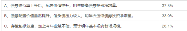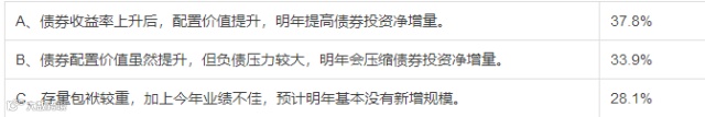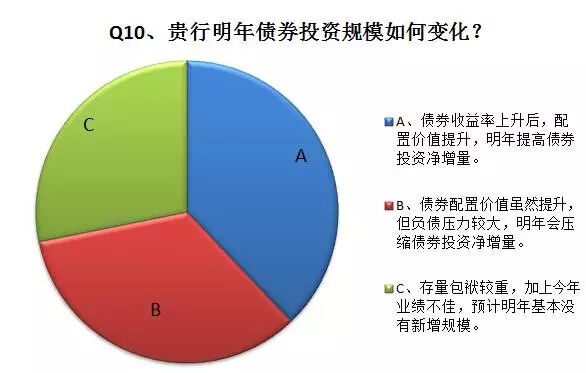 关于明年债券投资额度,大部分银行表示明年增加债券投资规模,但负债压力大仍是影响债券投资的重要因素,有38%的中小银行表示债券收益率上升后,债券配置价值上升,明年会提高债券投资净增量。