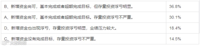 具体来看,37%的中小银行表示新增资金尚可,但存量投资浮亏明显;30%的中小银行表示新增资金尚可,且存量投资浮亏不严重;18%的中小银行表示新增资金和存量投资均出现明显浮亏,业绩压力较大;另外15%的中小银行表示新增资金没有完成目标,存量投资浮亏不严重。不过,此题建议跟问题13结合来看,或更能反映真实情况。