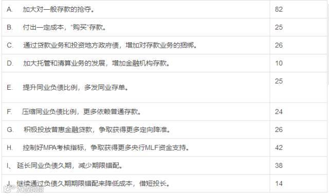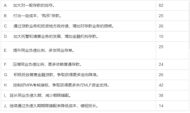 从本次中小银行调研来看,结合前面问题五来看,商业银行今年负债端压力较大,明年负债端压力下,更多加大一般存款的抢夺、寄希望于央行投放的流动性以及适度依靠同业负债。具体来看,80%的中小银行表示要加大一般存款的抢夺、23%也倾向于更加依赖普通存款,比如通过贷款和地方债、或通过一些方式“购买”存款等;41%表示争取过的更多央行资金支持(MLF、逆回购等);也有24%中小银行表示提升同业负债的比例、延长同业负债久期,或增加金融机构存款。