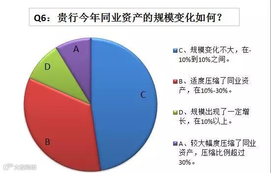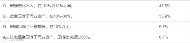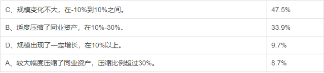 在同业资产的变动上面,近一半的中小银行表示规模变动不大,在-10%到10%之间。