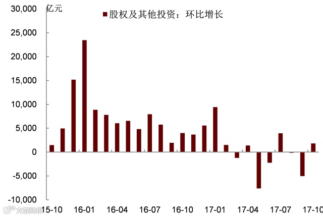 从上市银行的季报数据来看,银行今年持续在压缩同业资产,上市银行三季度全部资产同比增速为8.37%,较二季度的9.62%进一步回落,其中狭义同业资产同比增长-1.76%;主要是压缩了短期限的同业资产如同业理财、同业存放等。且从金融机构信贷收支表来看, “股权及其他投资”科目也连续几个月出现了下滑,5月和9月均下降超过5000亿元(下图为股权及其他投资:环比增长)。