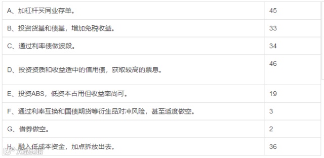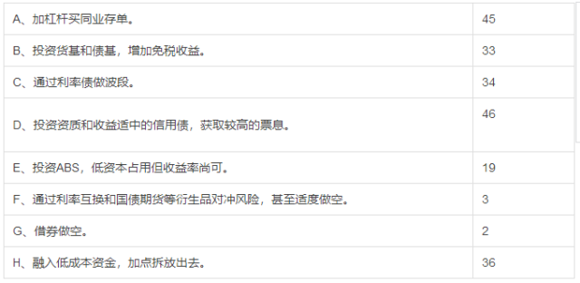 从问卷调查来看,今年中小银行的盈利主要来自于票息策略和加杠杆买同业存单,占比均在40%以上。同时,对中小银行收益贡献较多的策略为低成本融入资金,加点拆放出去、通过利率债做波段和投资货基和债基,增加免税收益,占比30%以上。