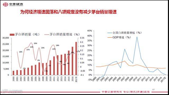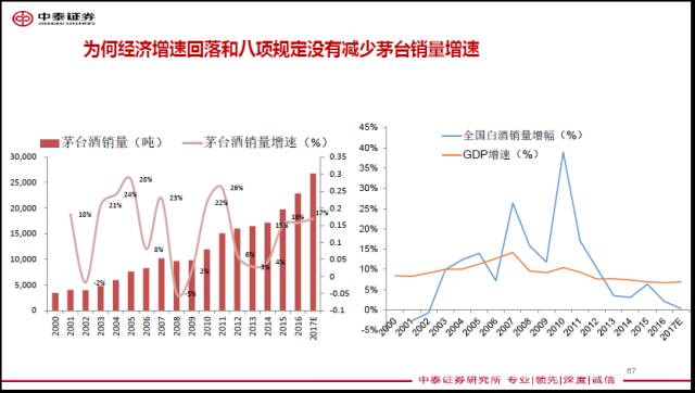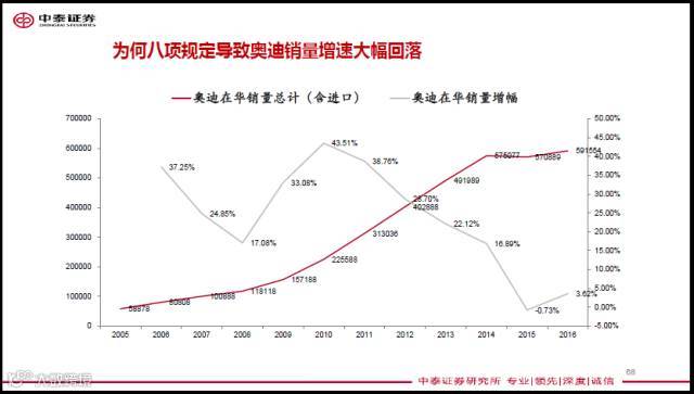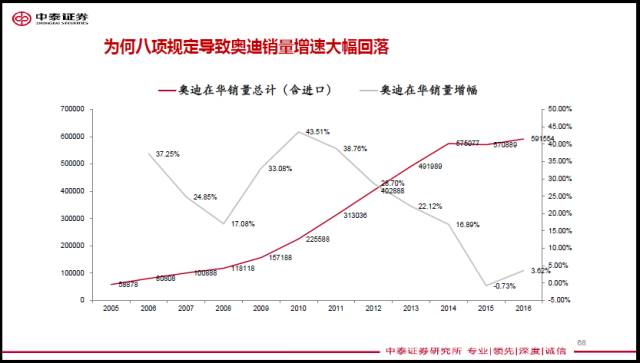不过,八项规定却有效抑制了奥迪销量的增速,这张是奥迪销量增速大幅回落的图。两者增速差异的背后是什么原因呢?大家可以去思考一下。我们选择消费股的时候要有深层考虑:茅台酒除了有消费功能,还有储藏升值的投资功能;奥迪车在八项规定出来之前,具有身份象征功能,而现在,既无投资功能,又失去了“官车”的代表意义。