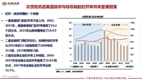 在这样的底线思维下,投资的风险就显得不大了。从美国和日本经济政策去杠杆的事例看,也没有实现全面去杠杆。发生金融危机之后,两国政府杠杆率均出现上升,居民杠杆率则明显回落,但非金融企业部门的杠杆率则没有出现明显的回落。因此,从全球来看去杠杆都是国际性难题,不要认为想去就能去得掉,从而把金融监管的加强视作股市或楼市的利空因素。