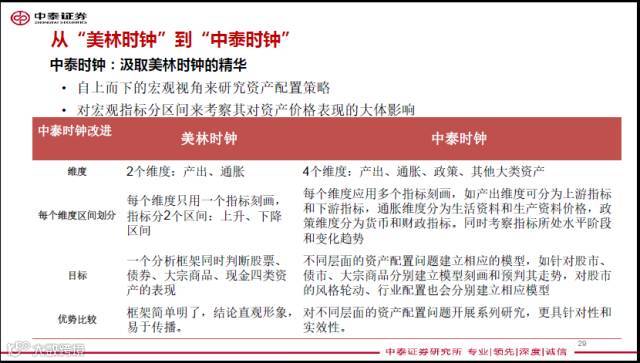 先介绍一下我们做资产配置研究的“中泰时钟”。大家都知道“美林时钟”,它是根据经济周期配置资产,经济周期的不同阶段配置不同的资产。例如,复苏阶段配股票,经济过热时配债券,滞胀配大宗商品,衰退配现金。有人戏称,美林时钟像电风扇,转得太快,以至于参照它配置资产时无所适从。