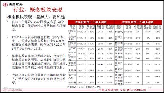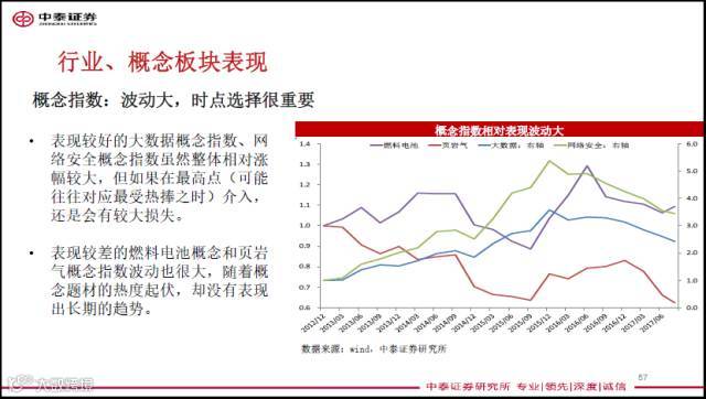 另外,炒概念、炒题材到底有没有意义?我们的统计结果是,有技术含量的概念题材是有意义的,比如技术革新类,如网络安全、互联网金融、网络游戏、在线教育、智慧医疗、智能电视、文化传媒、大数据、第三方支付、云计算等。表现较差的是什么概念呢?是页岩气、生物育种、稀土永磁、高端装备制造、燃料电池、丝绸之路、核能核电、新疆振兴、广东国资改革,这些题材的股价表现不佳,因此,还是要区分哪些题材和概念有意义,不要瞎炒。