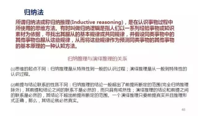 归纳法就是从特殊到一般,我们可以用大数据归纳来分析出共性的东西。归纳法的运用很广泛,比如,茅台酒价格上涨和澳门博彩业收入上涨是否存在相关性?与挖掘机的销量增加是否有相关性?这种相关性背后的逻辑关系是什么?这个背后的原因可以根据更长期的历史来做相关性分析,可能与房地产的销售额上升相关性更高,这也属于归纳法的应用案例。