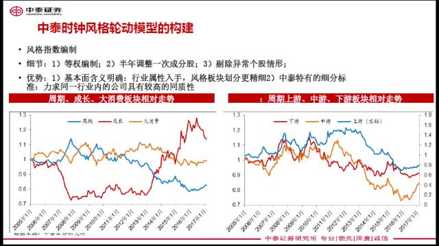 讲到权益类资产的配置,前文讲到 “中泰时钟”资产配置策略首先提供的是风格轮动策略,即判断市场风格的变化。我们把权益类资产分成五大类:周期性上游板块、周期性中游板块、周期性下游板块、成长性板块和大消费板块。