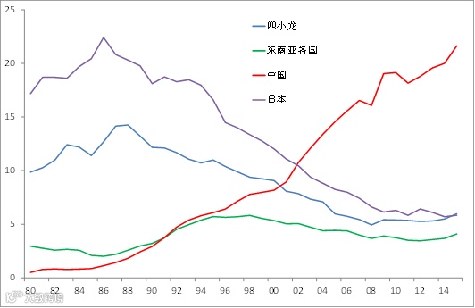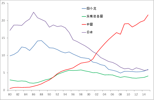中国、日本、四小龙、东南亚各国对美出口份额的变化: