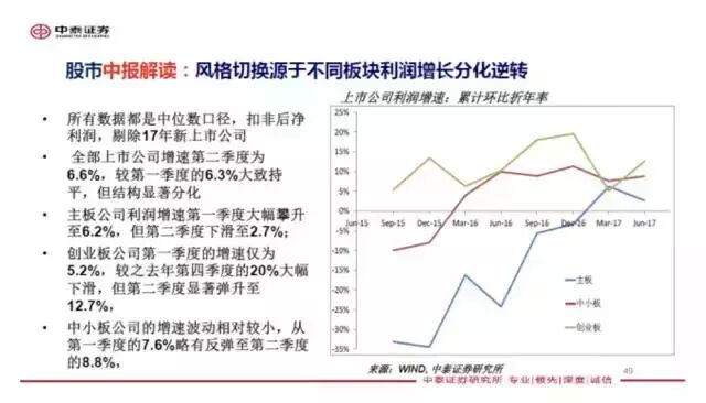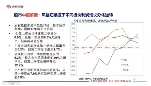 也有不少研究机构在发布上市公司总体业绩报告时,会声明“剔除银行板块、剔除两桶油”,但是,还有一些企业如中国平安、茅台等,他们的市值和盈利占比也非常大,如何排除掉这类公司对整体盈利水平的影响呢?所以,剔除谁或者不剔除谁,很难制定出一个具有说服力的衡量标准。而只取中位数,就可以避免个别公司对所有上市公司整体业绩的影响。因此,通过季度累积折年率、剔除非经常性损益再取中位数的统计方法,所得到的数据就比较客观。我们据此分析中报得到的结论是,创业板盈利增速回升了。