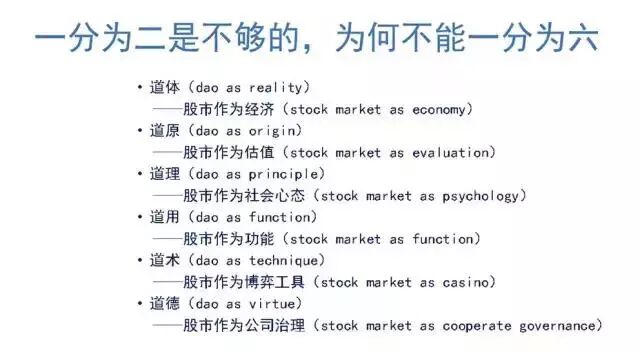 台湾有个研究诠释学的学者叫傅伟勋,他对“道”的诠释很到位,提出“道”有六义:道体、道原、道理、道用、道术、道德。我在他理论的基础上进行了创新,提出股市的六义: