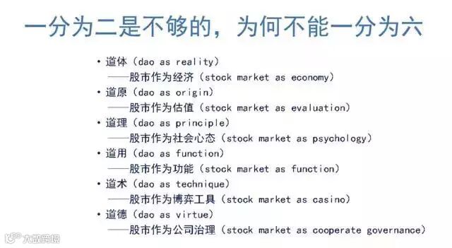 第二,股市发现价值,对应“道原”,券商分析师们要分析股票到底值不值这个钱,要用估值模型来判断;
