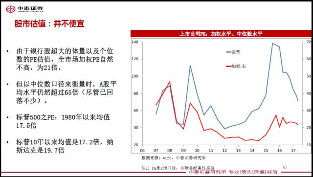 2016年之后,市场逐步回归理性。我们同样用中位数计算了目前A股市场的市盈率,将3300多家上市公司按市盈率高低排序取中位数(即自上而下的第1650只股票),发现该股票的市盈率为65倍(剔除非经常性损益)。也就是说,目前A股市场市盈率的中位数是65倍,而通过加权平均数计算的市盈率只有21倍。尽管从加权平均数看,A股颇有投资价值,但毕竟低估值的股票少,且今年以来也已经涨了不少,能否持续上涨呢?从历史来看,低估值股票之所以涨不起来,是因为有不被市场认可的原因,难道今后就会被认可了?