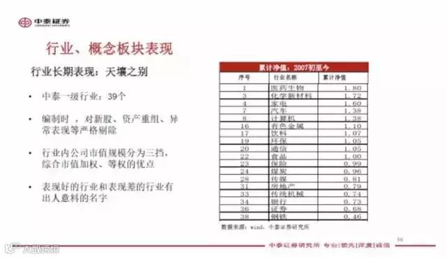 对权益资产配置而言,很多人注重行业配置。无论是选行业也好,还是选主题投资也好,投资收益率最有说服力。从长期来看,资产配置侧重行业的不同,对收益率的影响非常大。我们总共分了39个行业,研究发现在过去十年中,净值增加最多的是医药生物行业,最差是钢铁行业。这是过去十年的数据,你会发现这十年不同行业的净值差异非常大。所以,选行业资产配置策略非常有意义。